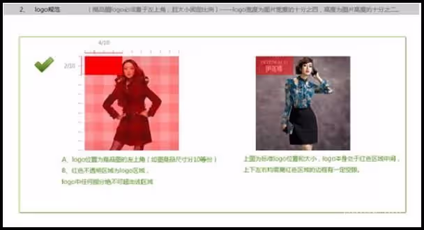 2) 商标所有人可将其拥有的LOGO放置于主图左上角,且LOGO大小固定比例以内,宽度为图片大小的十分之四以内,高度为图片大小的十分之二以内;