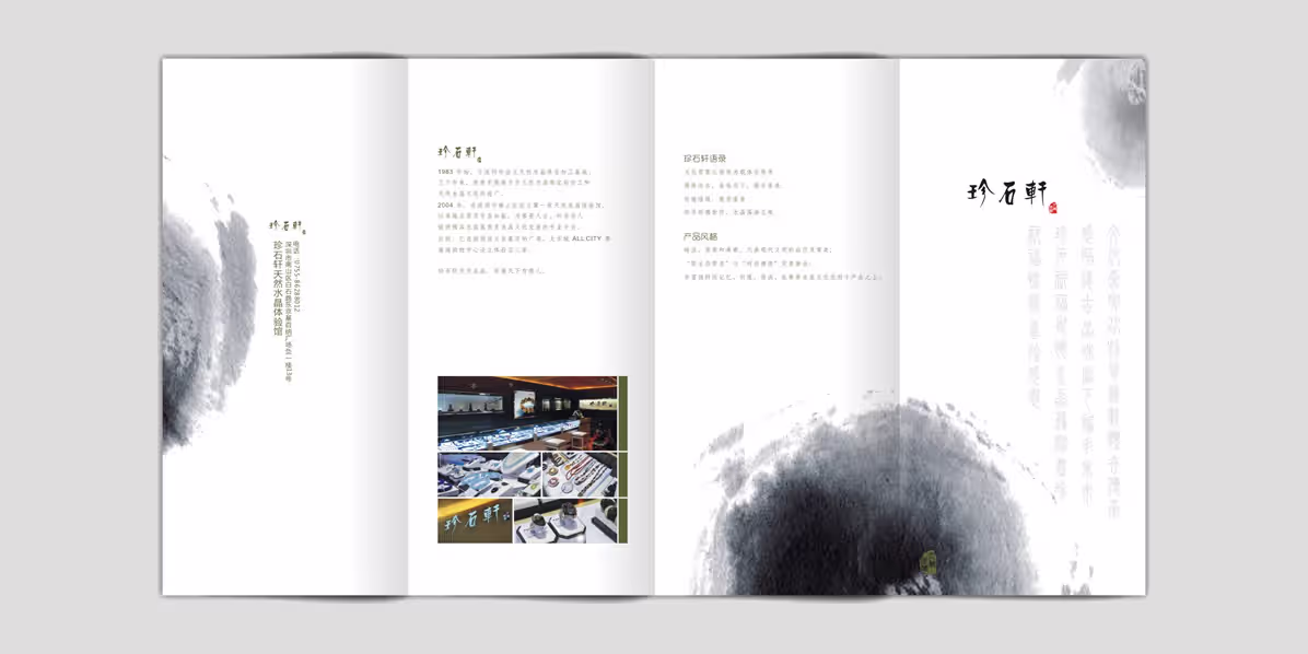 珍石轩宣传物料设计案例 Brand Client + 珍石轩 Project Date + 2010 Service Item + 宣传物料设计 Brand & Client Intro + 珍石轩,1983年始,致力于天然水晶珠宝的加工。2004年,在深圳南山设立第一家天然水晶体验馆,以卓越品质及专业知能,为尊贵人士、时尚达人提供精品水晶鉴赏及水晶文化交流的专业平台。目前已在深圳设立京基百纳广场、太古城ALL CITY等高端购物中心设立天然水晶体验馆。 标签# 平面设计# 折页设计# 案例 阅读更多 Love Cafe 爱上咖啡店招设计 茯神琥珀品牌设计全案 色驴小窝品牌全案设计 Fancy Image 梵禧映画标识设计